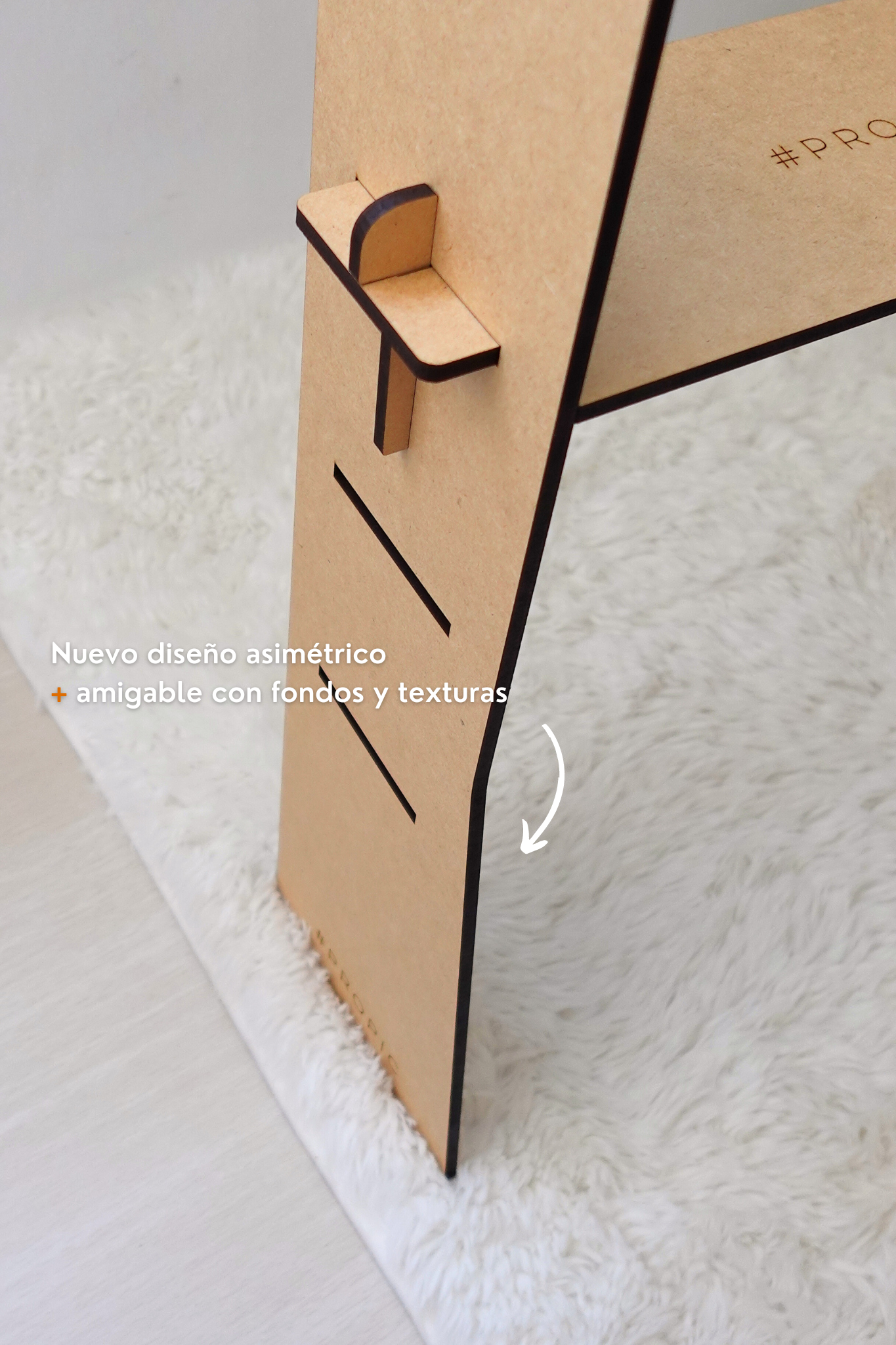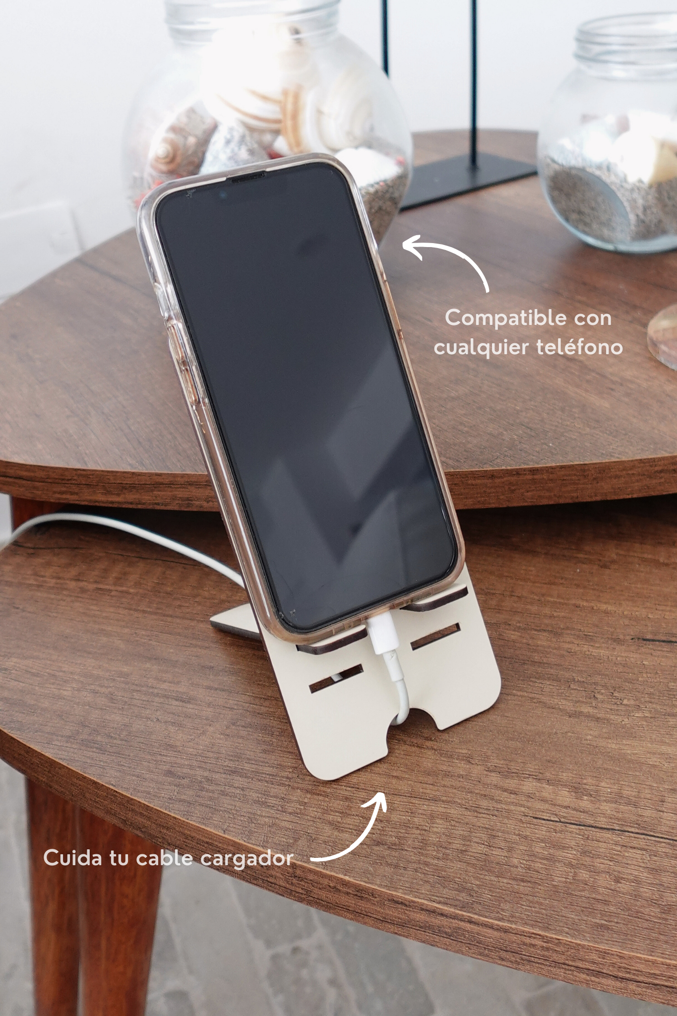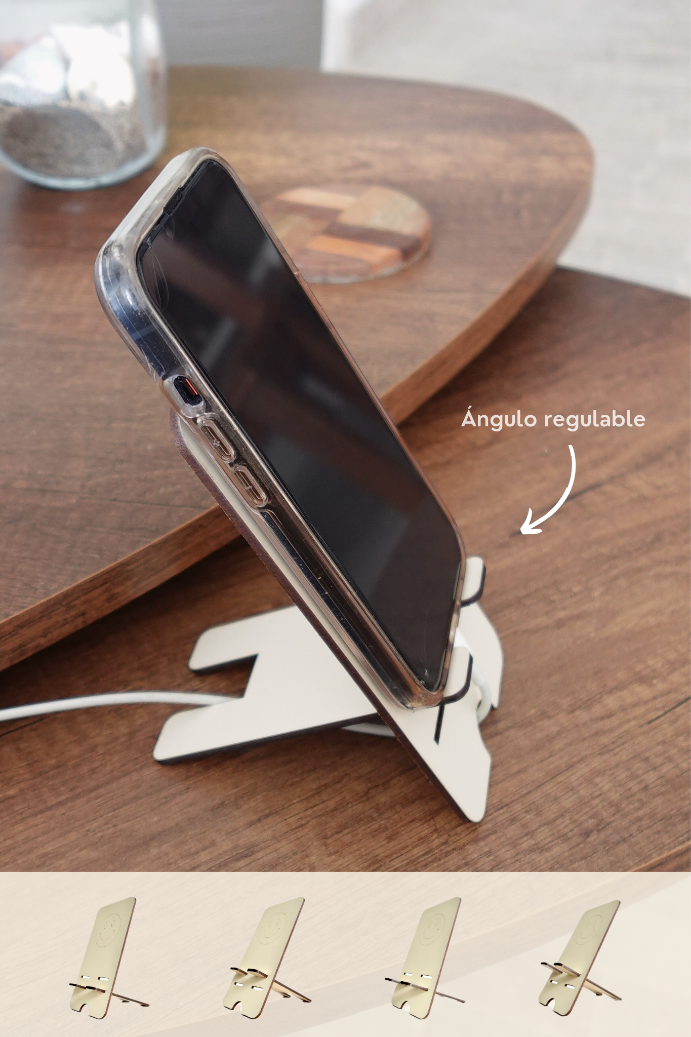 - Soporte para celular hecho de madera prensada extra resistente, con un acabado liso y uniforme.